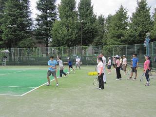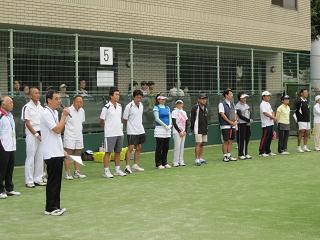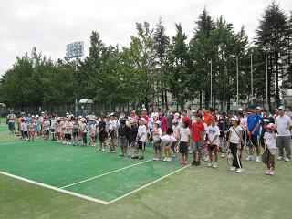 | 【開催日時】 平成23年9月23日(祝・金) 9時15分~15時15分 【開催場所】 等々力テニスコート(全10面) 1.参 加 :小学生102名、中学生9名、一般68名 |