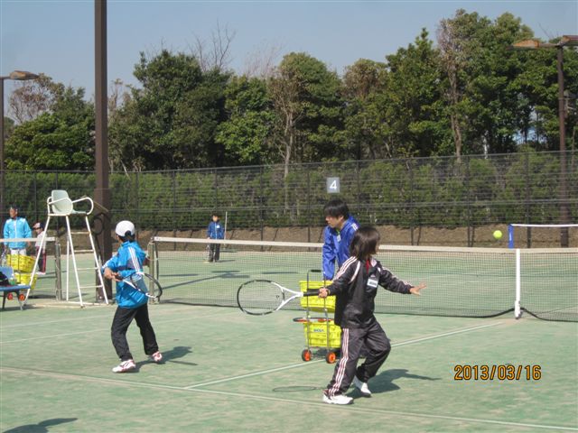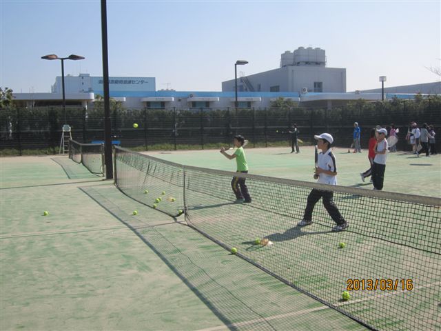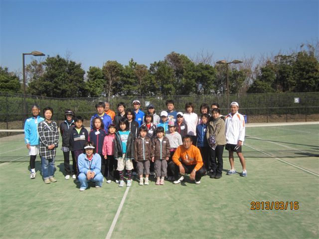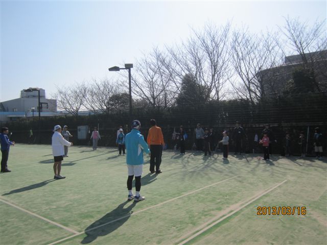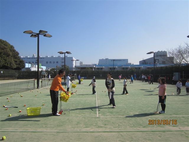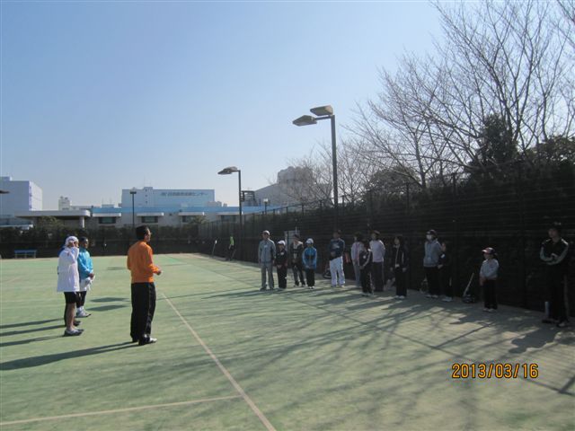 | 【開催日時】 平成25年3月16日(土)~3月31日(日) 9時~12時 【開催場所】 川崎マリエンテニスコート(3面使用) ◆参加 小中学生=18名、一般=10名 ◆内容 準備体操・ストロークの練習・ボレーの練習・ゲーム形式 |