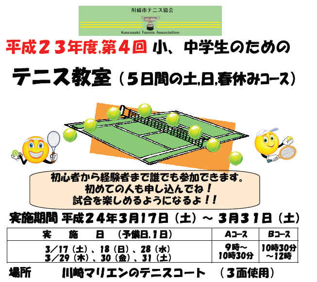 ⑦.平成23年度、第4回小、中学生のための体験教室と5日間のテニス教室開催案内 |