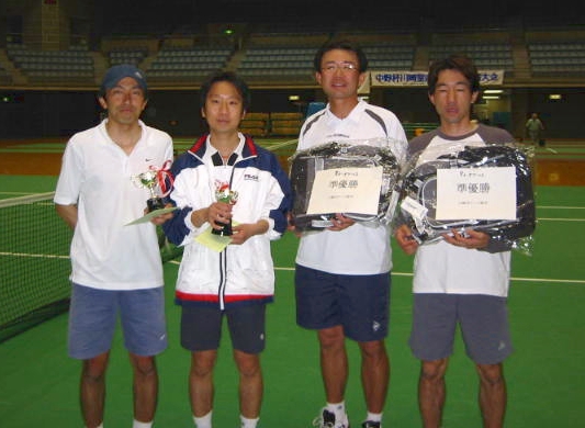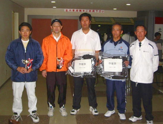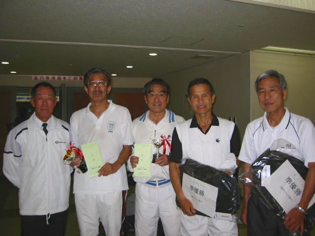 <男子45才ダブルス> 優勝:福寿・広野組 準優勝:貝谷・戸田組 (右端は高瀬会長)