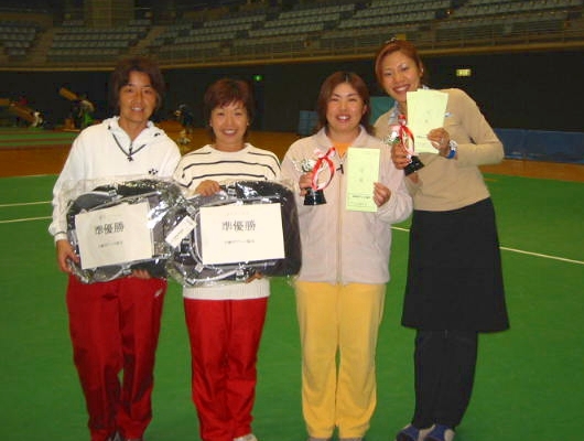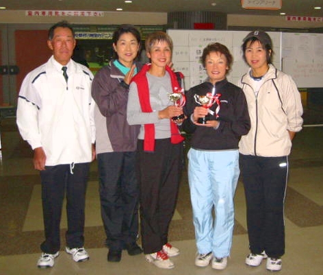 <女子45才ダブルス> 優勝:桧垣・岩里組(中央) 準優勝:待鳥・田中組(両側) (左端は高瀬会長)