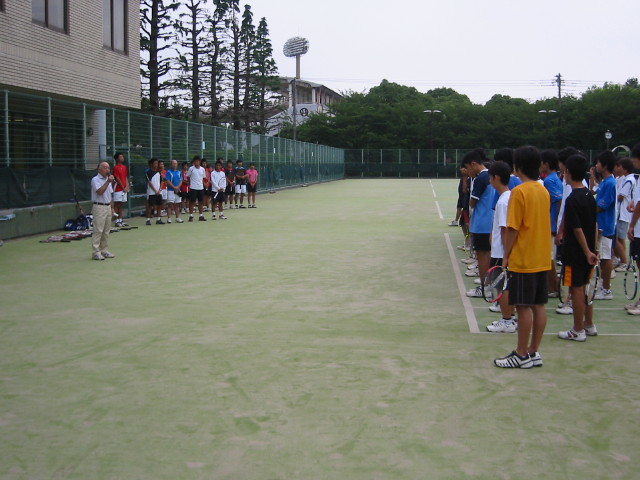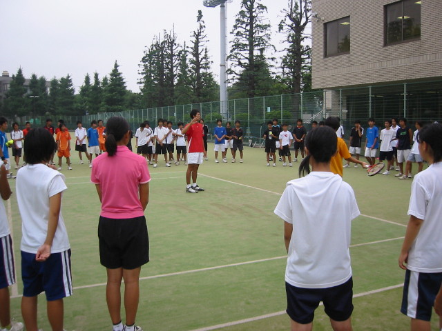 講習内容(21日) 9:00 開校式 9:15 ウオーミングアップ、コート割り 9:30 テニスのための基本運動 11:00 グループ練習(ストロ-ク、サービス、ボレー等) 16:30 閉校式